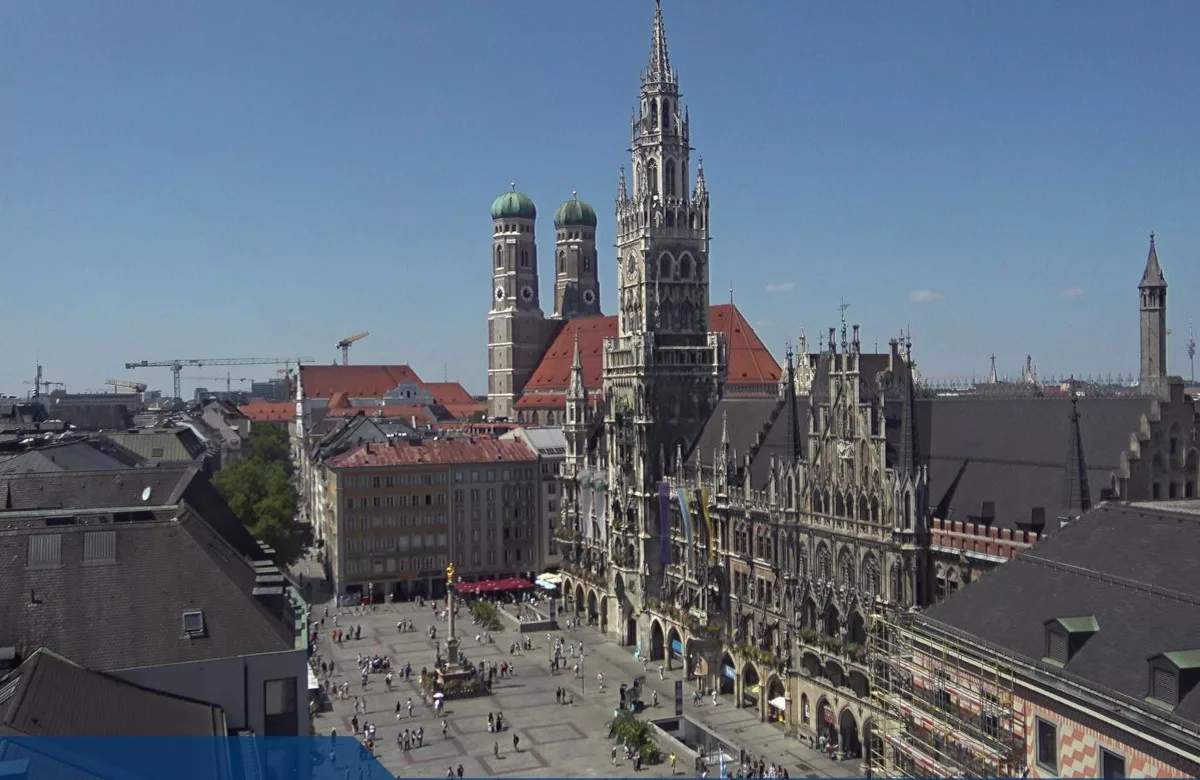Обзорная веб-камера в реальном времени показывает центральную площадь Мариенплац в Мюнхене в Германии.