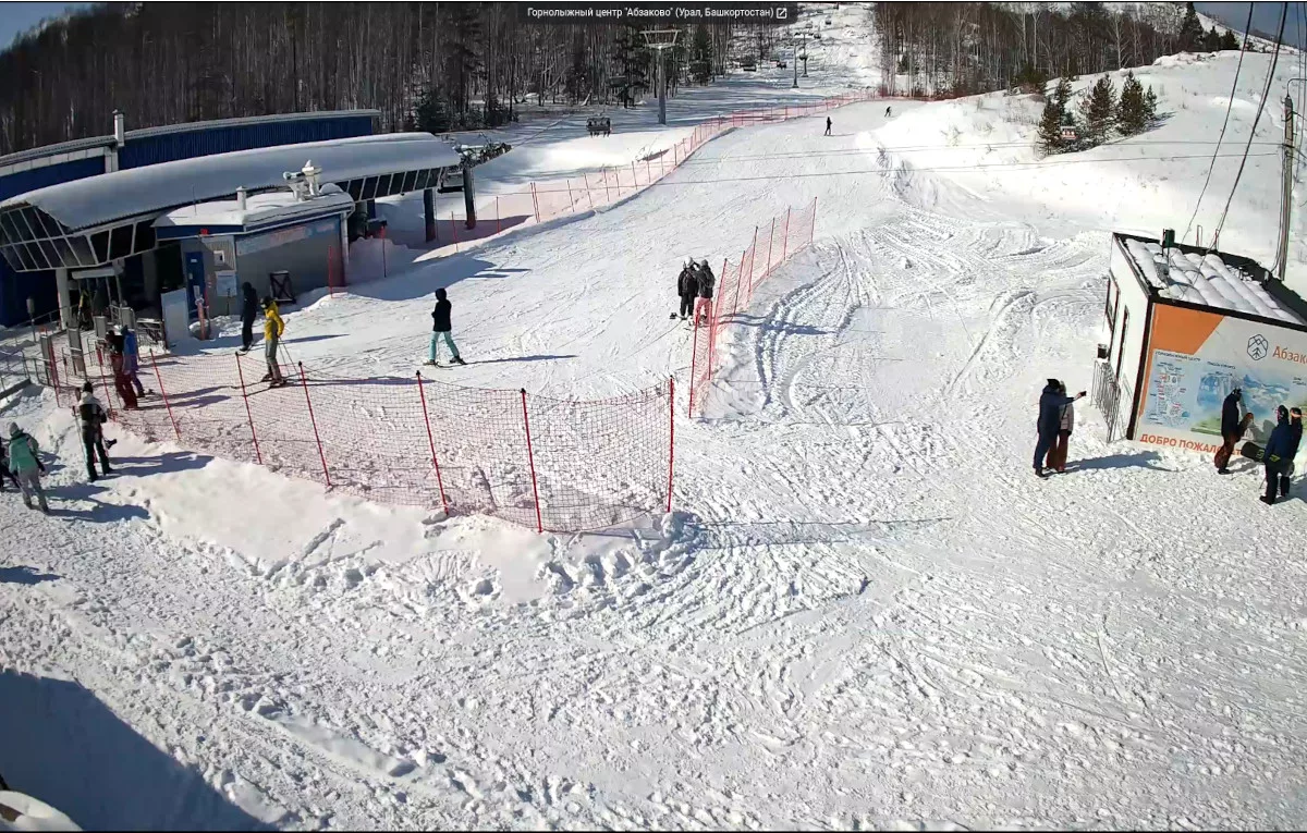 Веб-камера показывает станцию кресельного подъемника «Комета» горнолыжного курорта «Абзаково» в Башкортостане.