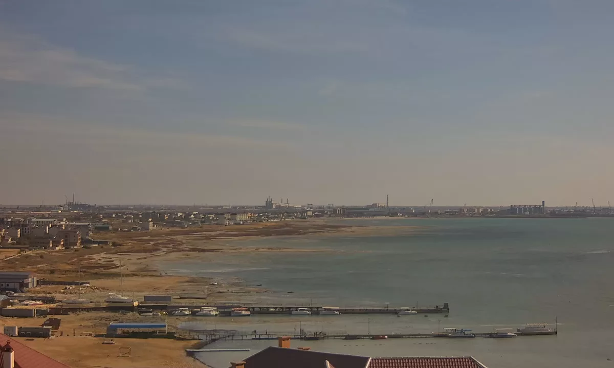 Веб-камера в реальном времени показывает побережье в центральной части Актау в Казахстане.