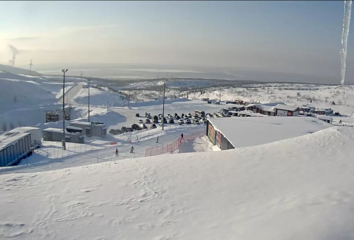 Веб-камера в реальном времени показывает парковку у Южного склона горнолыжного курорта «Большой Вудъявр».