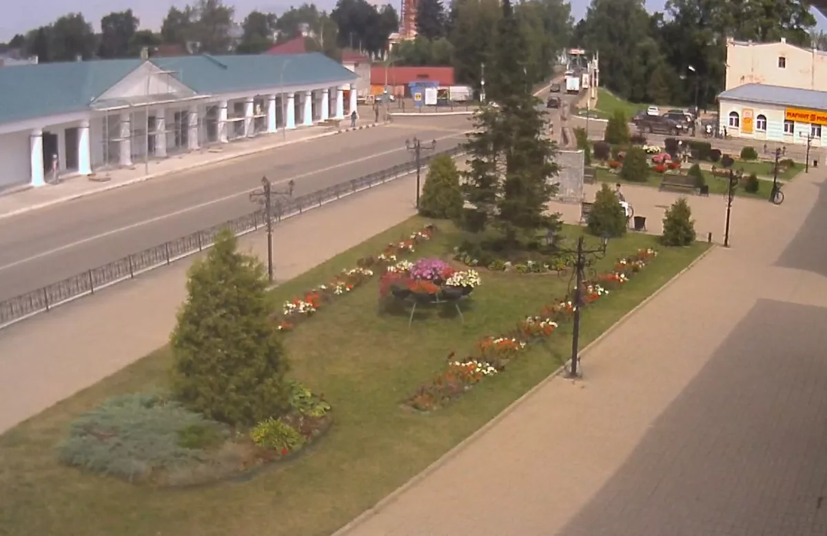 Веб-камера в реальном времени показывает Гостиный ряд в городе Нерехта в Костромской области России.