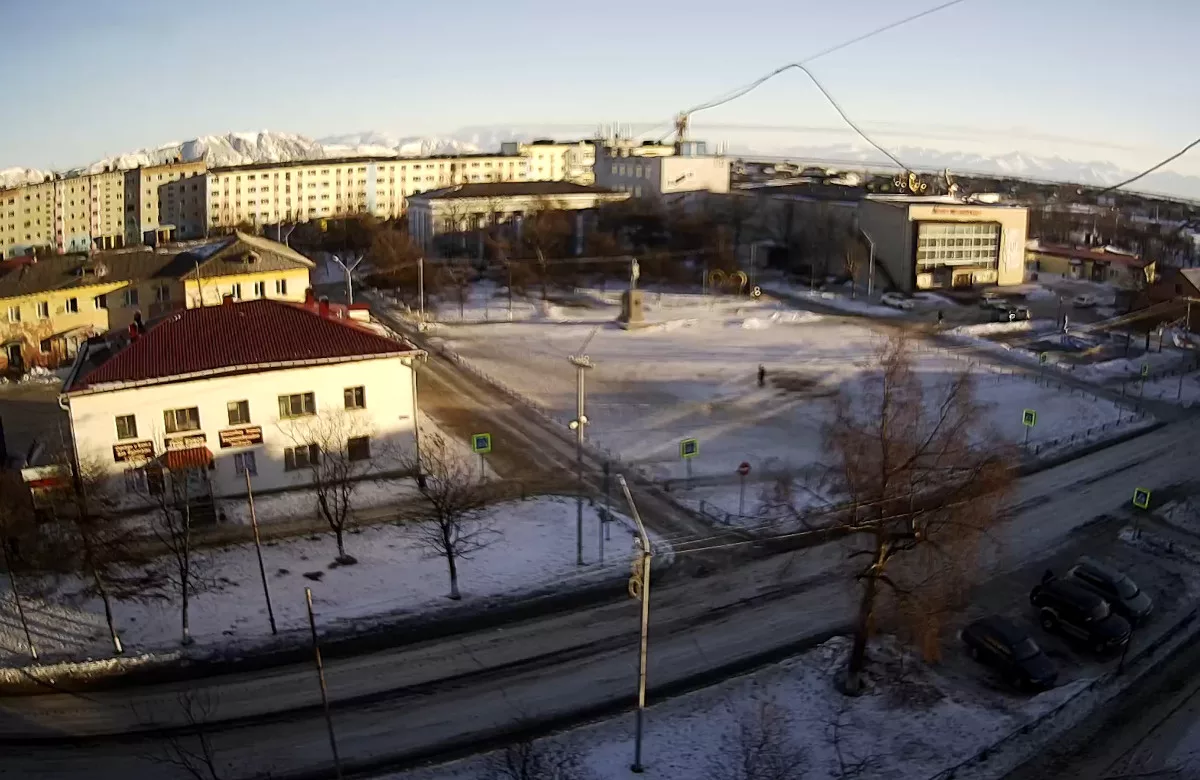 Веб-камера в реальном времени показывает Площадь Ленина в поселке Ола в Магаданской области России.